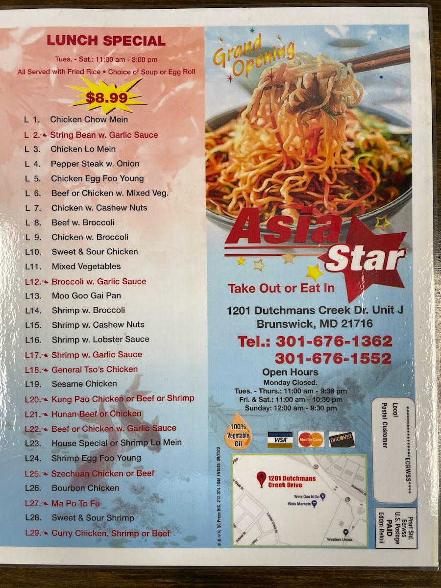 Welcome to Asia Star, a delightful Chinese restaurant nestled in Brunswick, MD. Located at 1201 Dutchmans Creek Dr, Asia Star offers a menu that caters to every palate with popular lunch specials and a variety of takeout options. Their Chicken Chow Mein, loaded with fresh vegetables and sliced chicken, is a customer favorite at just $9.25. For a spicy kick, patrons rave about the String Beans with Garlic Sauce. The fried rice options are equally enticing, featuring specialties like House Special Fried Rice, blending pork, chicken, and shrimp for a hearty meal.
